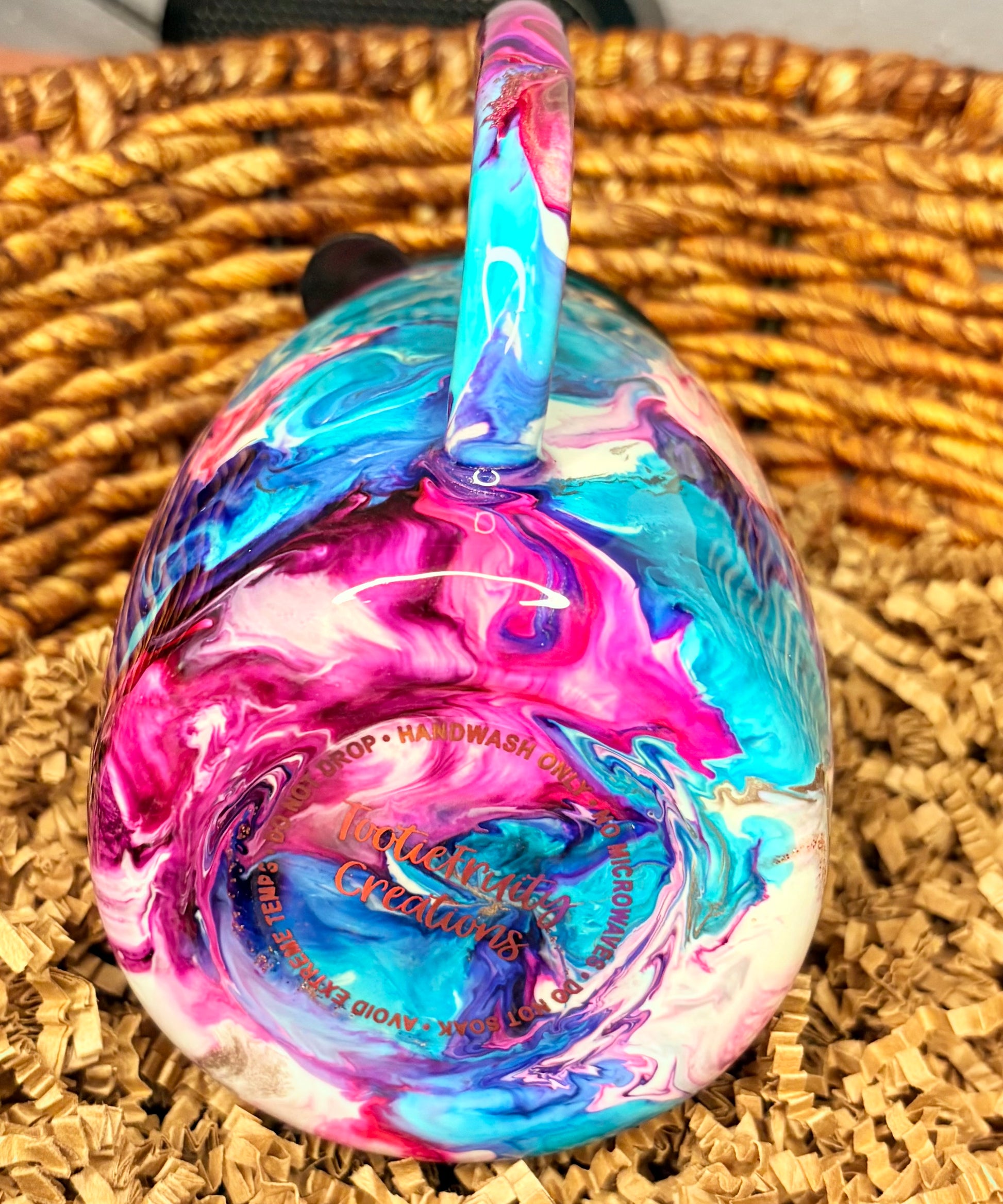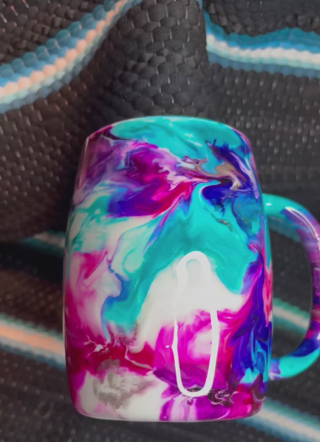 Elevate your coffee experience with this stunning 14oz round coffee mug, featuring a mesmerizing swirl of vibrant pink, blue, purple, and white hues. Each mug is uniquely handcrafted with an eye-catching marbled design, sealed with a glossy finish for durability. The comfortable handle and secure lid make it perfect for sipping your favorite hot or cold beverages in style. Whether at home or on the go, this artistic mug is a must-have for any coffee or tea lover!