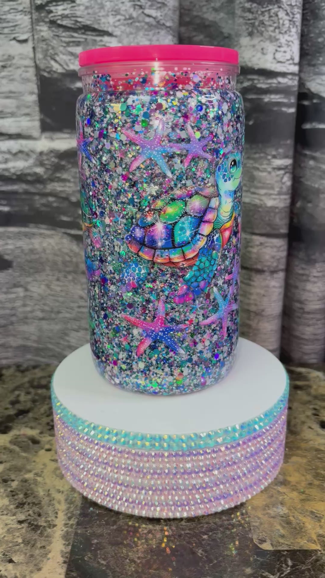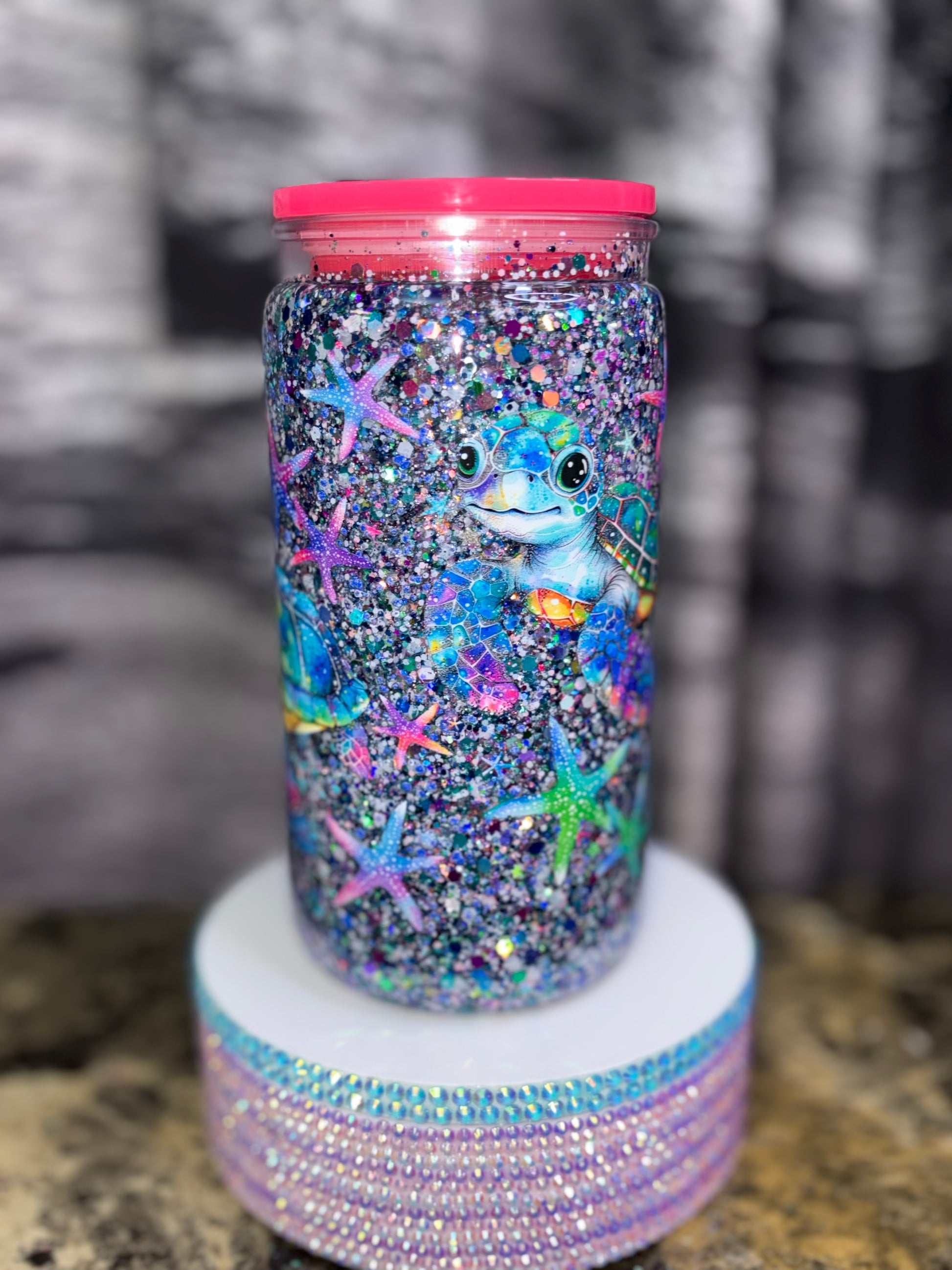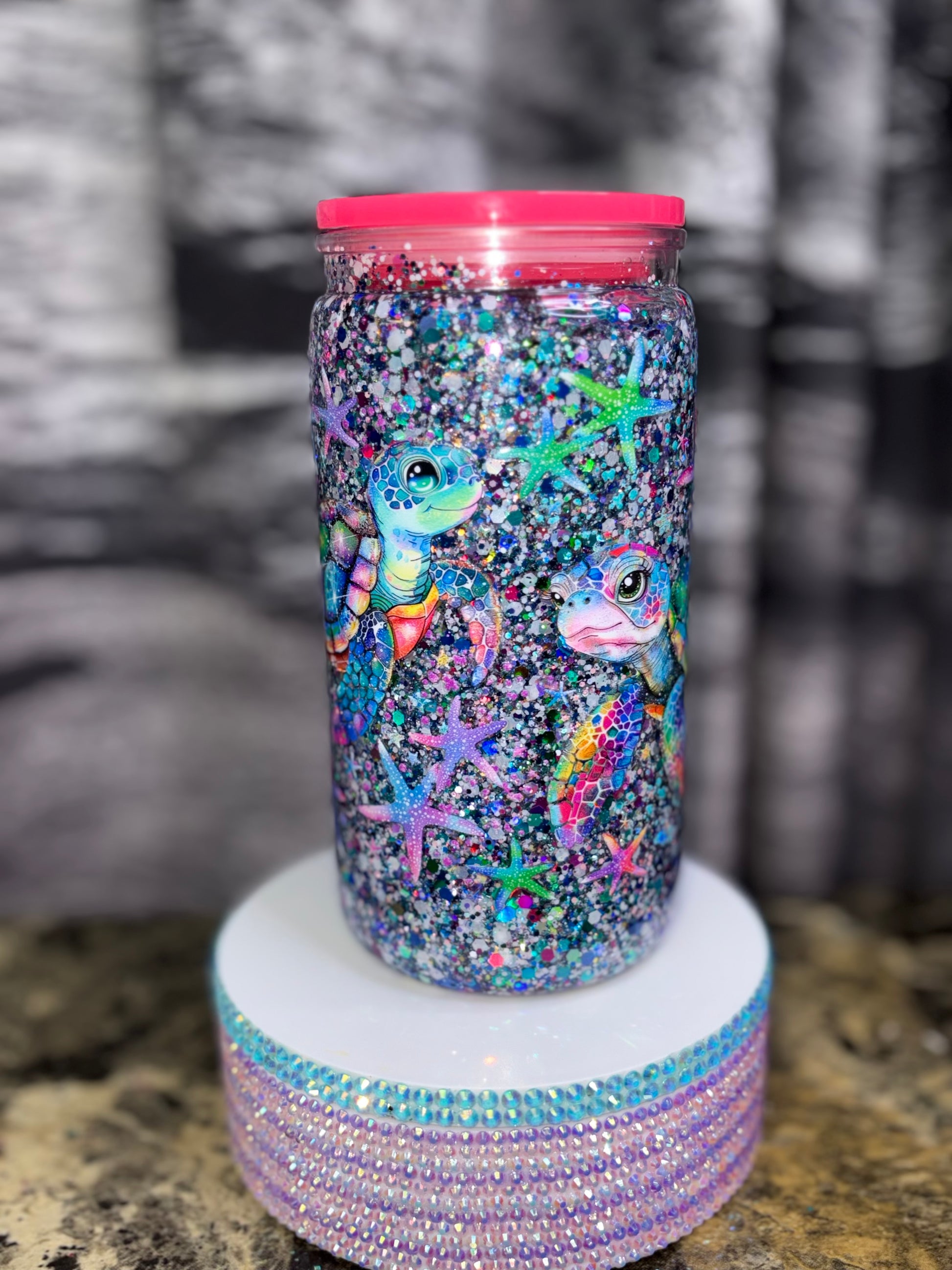 Enjoy your hot or cold beverages in style with our Turtle Snow Globe Tumbler. The double-walled design keeps drinks at the desired temperature while the fun snow globe feature adds a playful touch. Made from durable materials, this tumbler is perfect for on-the-go use.